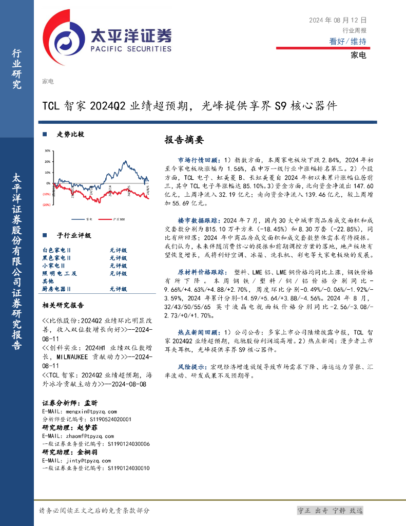 太平洋证券:家电行业周报:TCL智家2024Q2业绩超预期,光峰提供享界S9核心器件.pdf