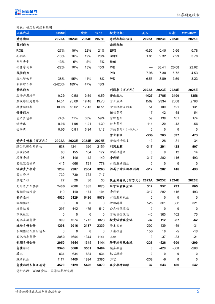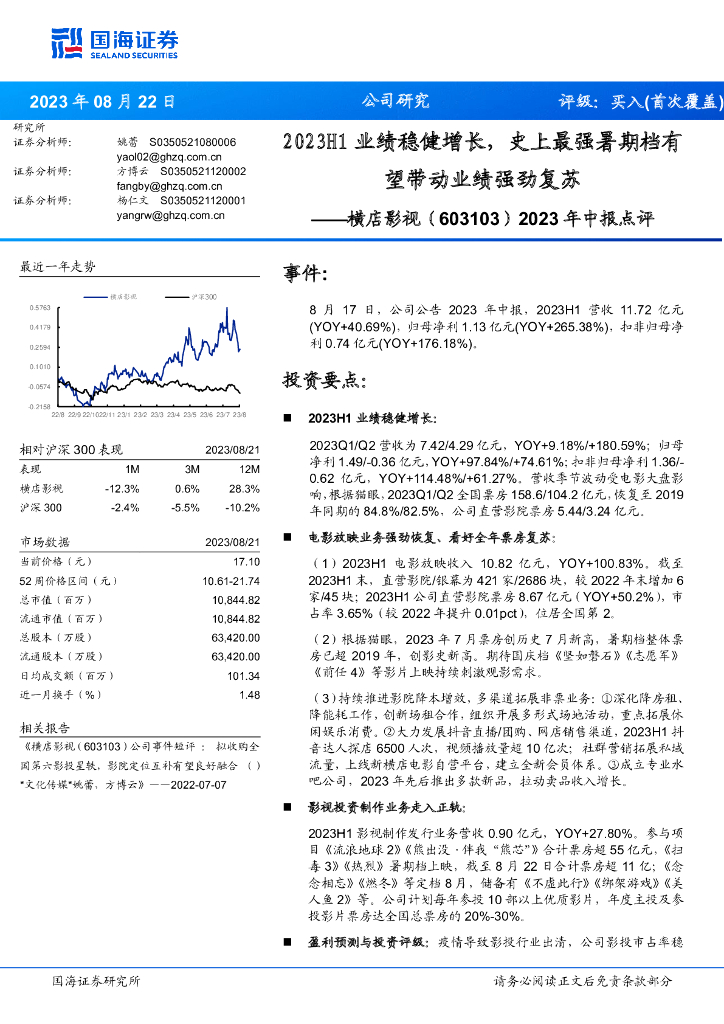 国海证券:横店影视(603103)-2023年中报点评:2023H1业绩稳健增长,史上最强暑期档有望带动业绩强劲复苏.pdf