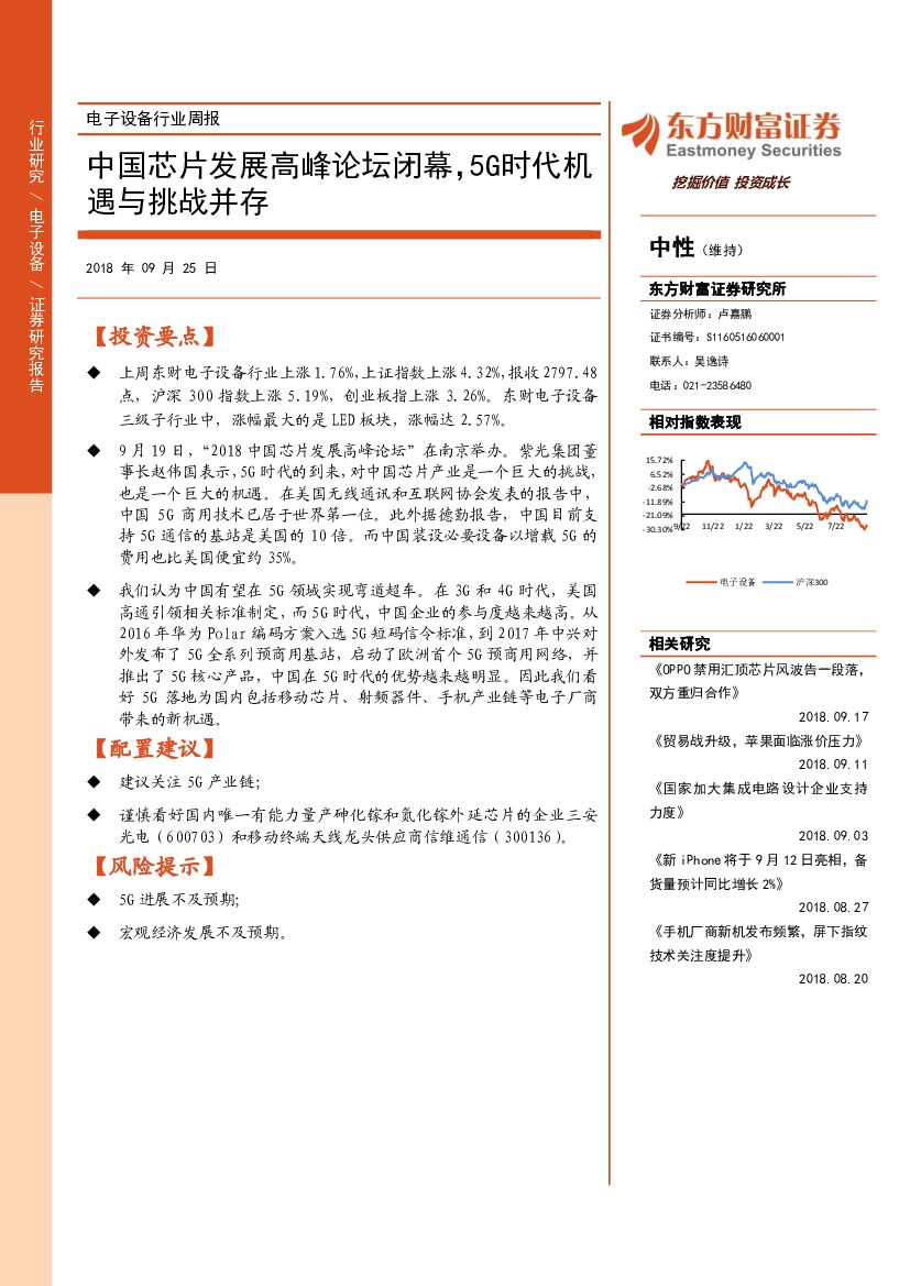东方财富证券:电子设备行业周报:中国芯片发展高峰论坛闭幕,5G时代机遇与挑战并存.pdf