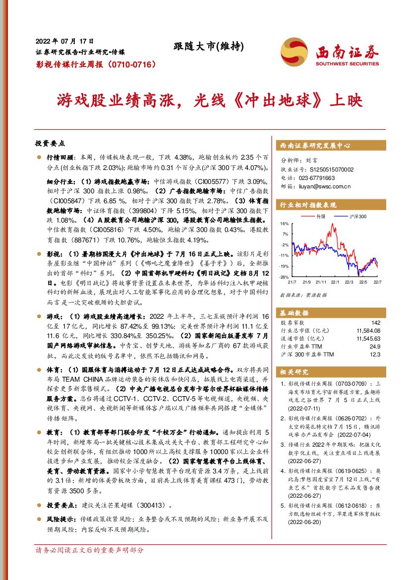 西南证券:影视传媒行业周报:游戏股业绩高涨,光线《冲出地球》上映.pdf