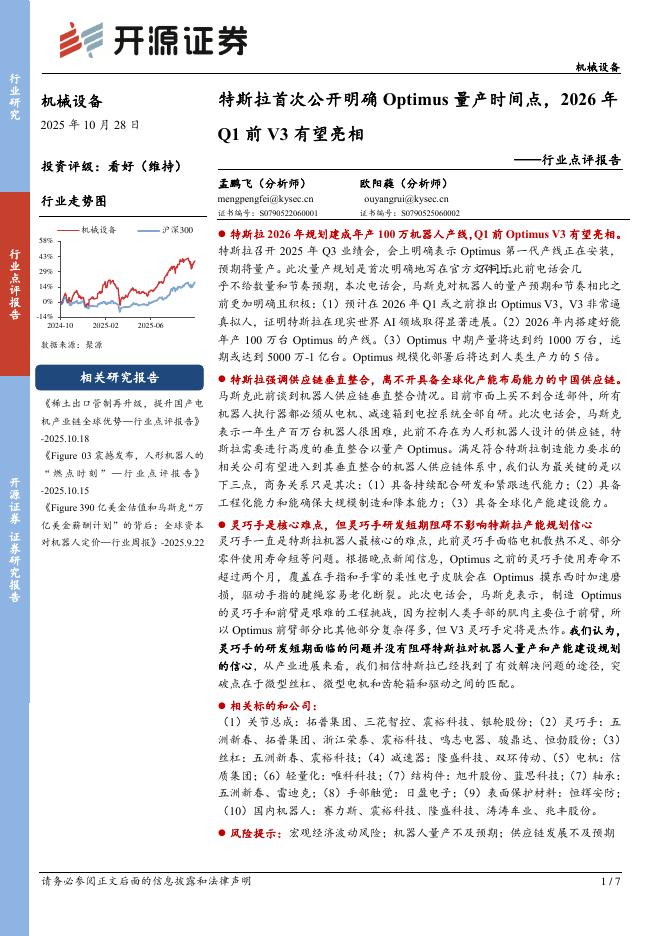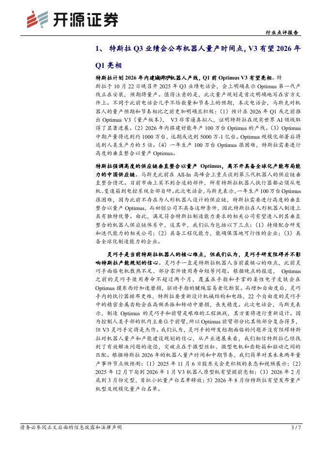 开源证券:机械设备行业点评报告:特斯拉首次公开明确Optimus量产时间点,2026年Q1前V3有望亮相.pdf