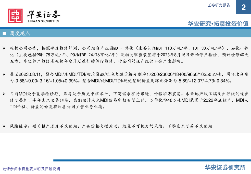 华安证券:万华化学基本面周度动态跟踪:烟台MDI、石化装置检修,开工率和库存下降.pdf