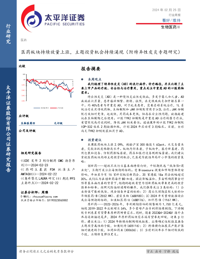 太平洋证券:生物医药Ⅱ行业周报:医药板块持续放量上涨,主题投资机会持续涌现(附特异性皮炎专题研究).pdf