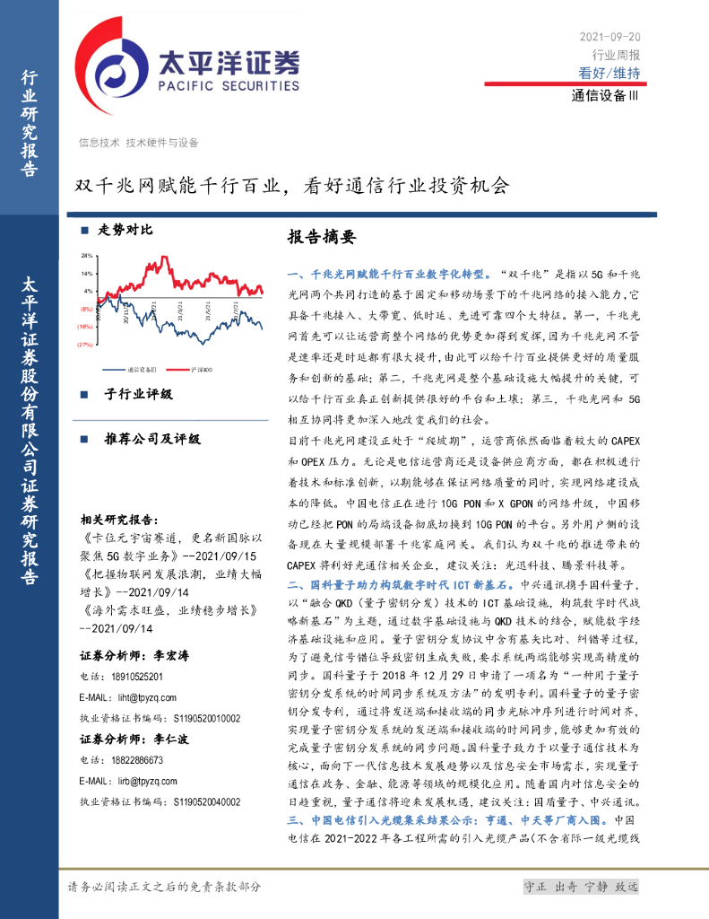 太平洋证券:通信设备Ⅲ行业周报:双千兆网赋能千行百业,看好通信行业投资机会.pdf