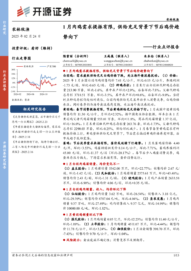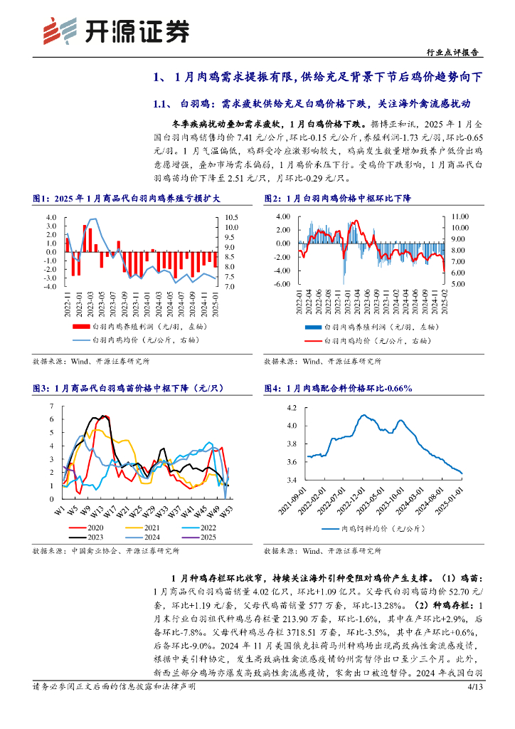 开源证券:农林牧渔行业点评报告:1月肉鸡需求提振有限,供给充足背景下节后鸡价趋势向下.pdf