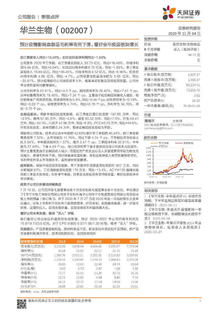 天风证券:华兰生物(002007)-预计疫情影响血制品毛利率有所下滑,看好全年疫苗板块增长.pdf