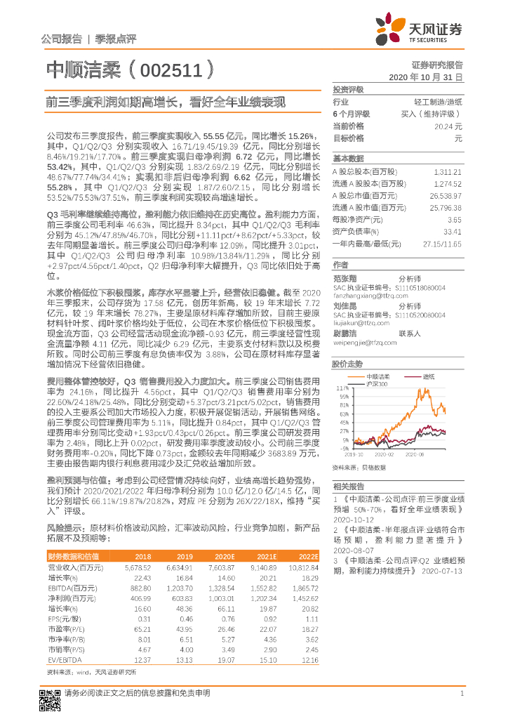天风证券:中顺洁柔(002511)-前三季度利润如期高增长,看好全年业绩表现.pdf