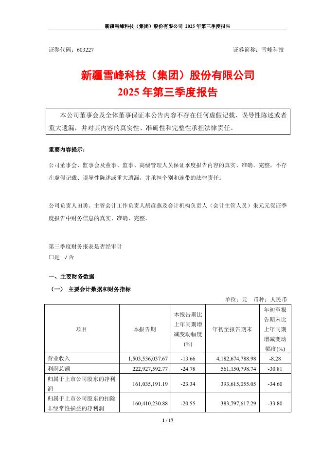 603227-雪峰科技:新疆雪峰科技(集团)股份有限公司2025年第三季度报告.pdf