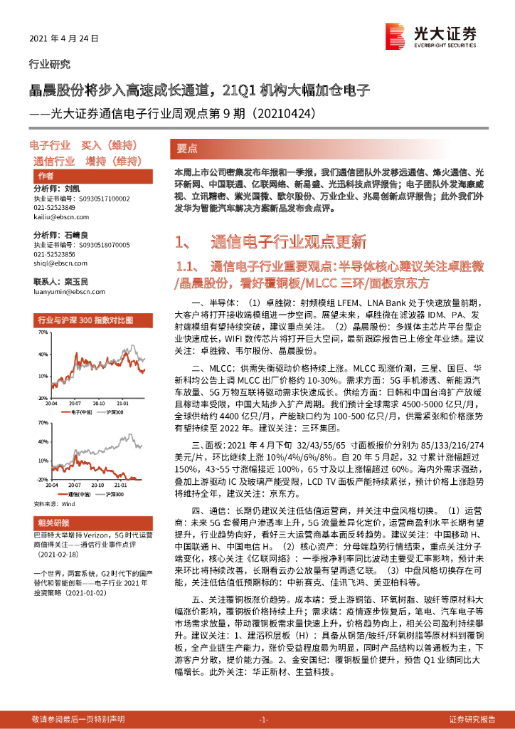 光大证券:通信电子行业周观点第9期:晶晨股份将步入高速成长通道,21Q1机构大幅加仓电子.pdf