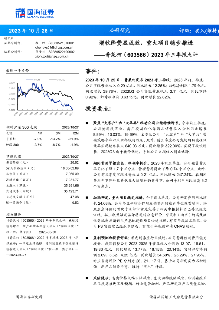 国海证券:普莱柯(603566)-2023年三季报点评:增收降费显成效,重大项目稳步推进.pdf