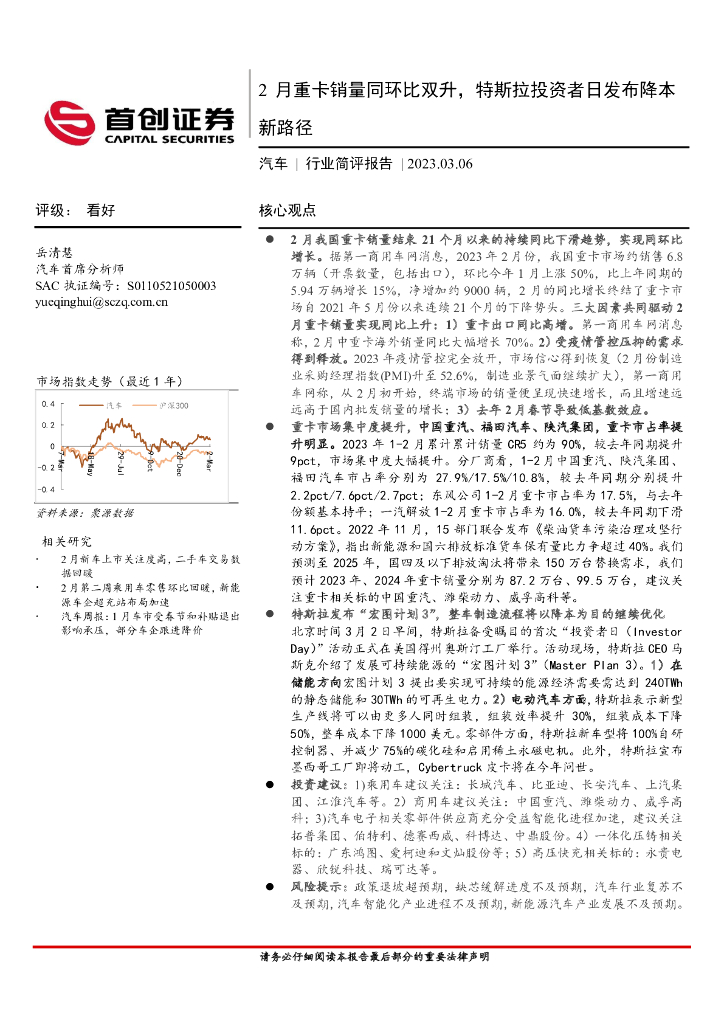 首创证券:汽车行业简评报告:2月重卡销量同环比双升,特斯拉投资者日发布降本新路径.pdf