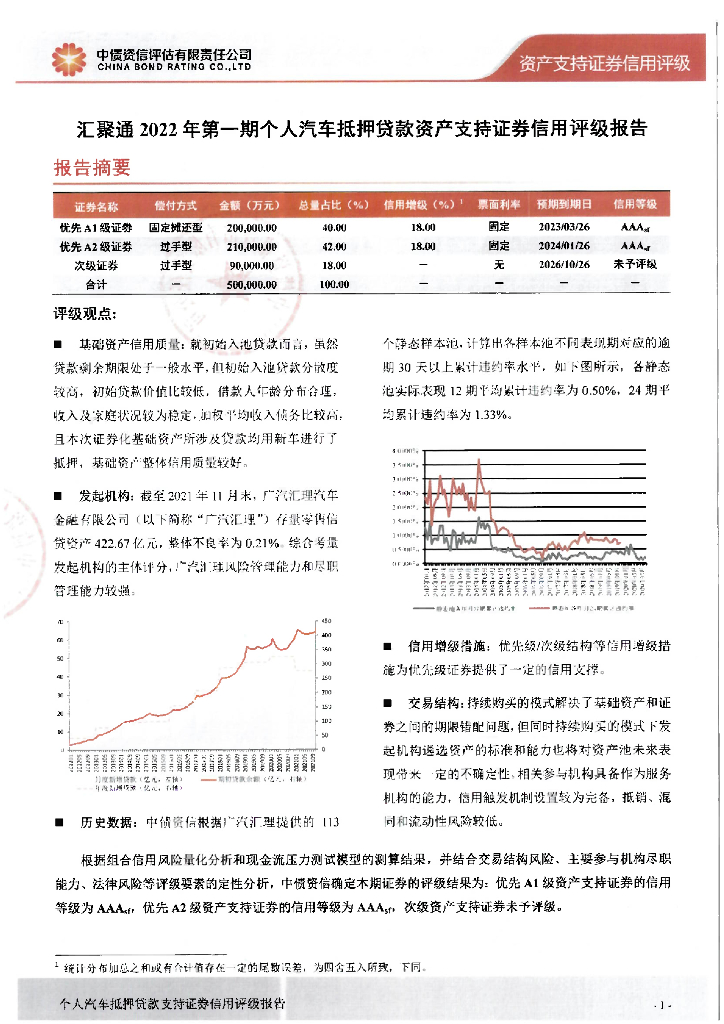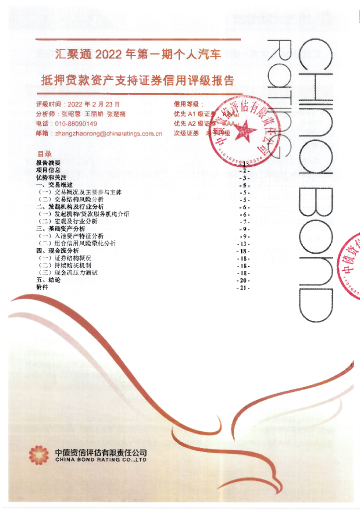 中债资信:汇聚通2022年第一期个人汽车抵押贷款资产支持证券售前评级报告及跟踪评级安排.pdf