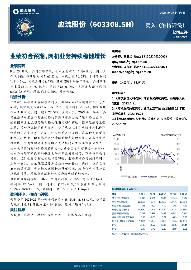 国金证券:应流股份(603308)-业绩符合预期,两机业务持续稳健增长.pdf