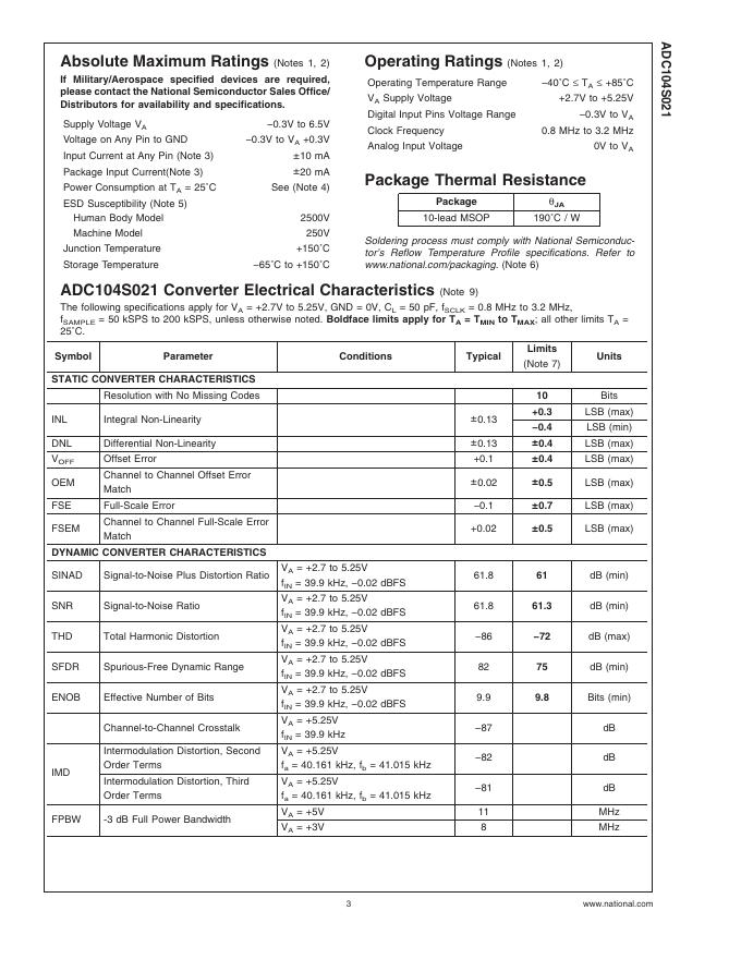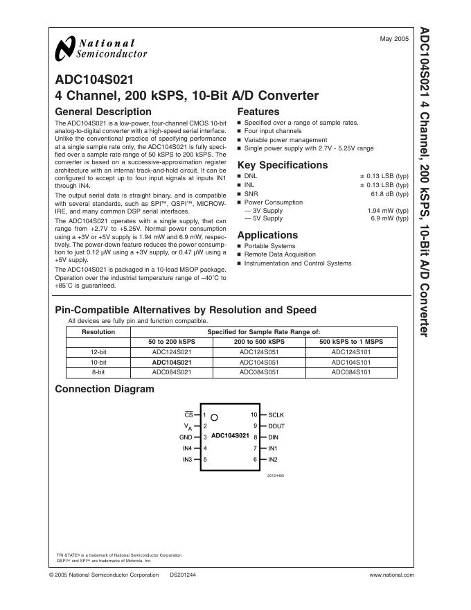 NATIONAL SEMICONDUCTOR - ADC104S021 4 Channel, 200 kSPS, 10-Bit A/D Converter 数据手册.pdf