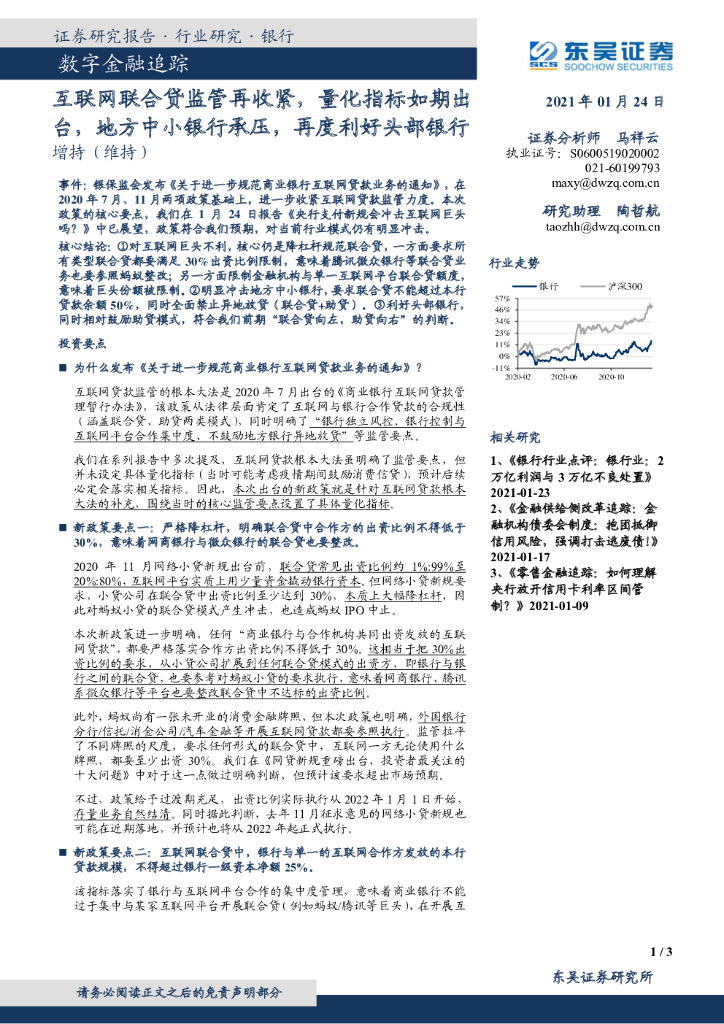 东吴证券:数字金融追踪:互联网联合贷监管再收紧,量化指标如期出台,地方中小银行承压,再度利好头部银行.pdf