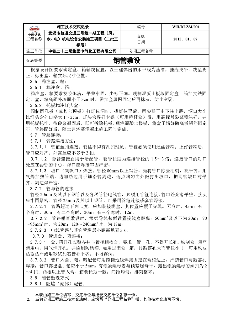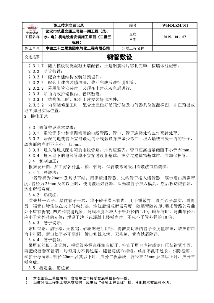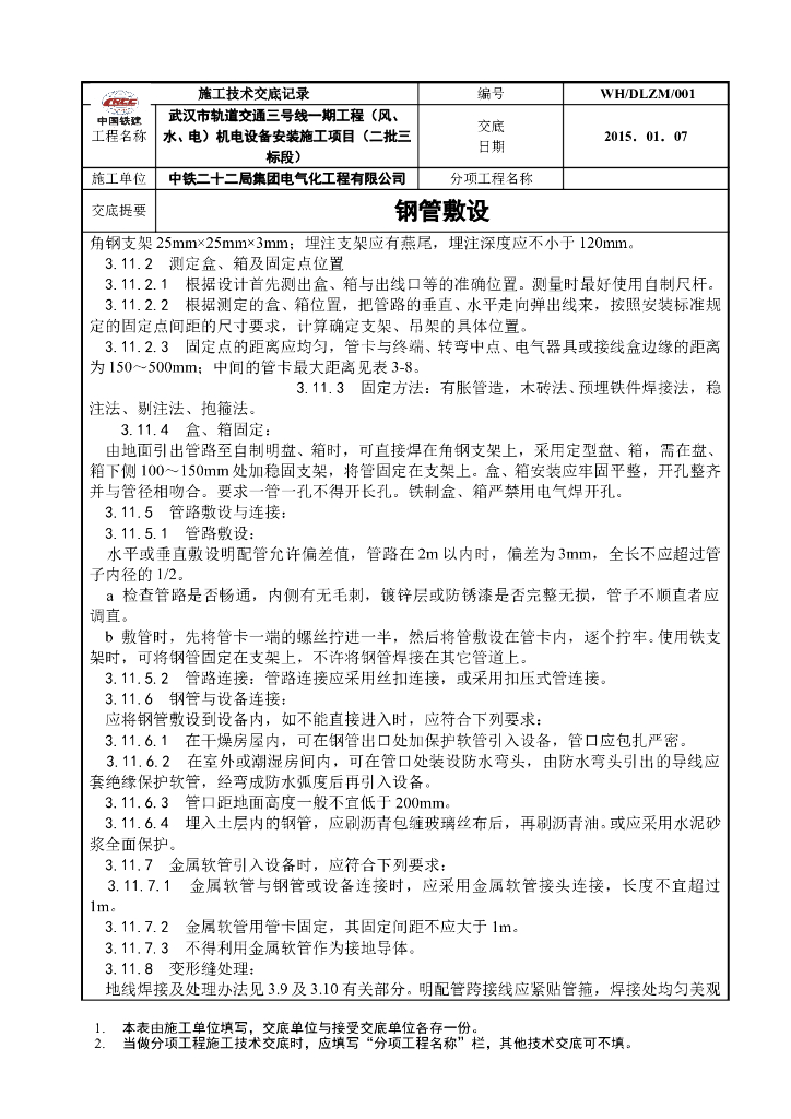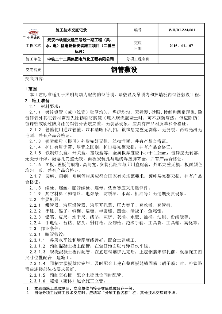 钢管敷设工艺技术交底(中国铁建).doc
