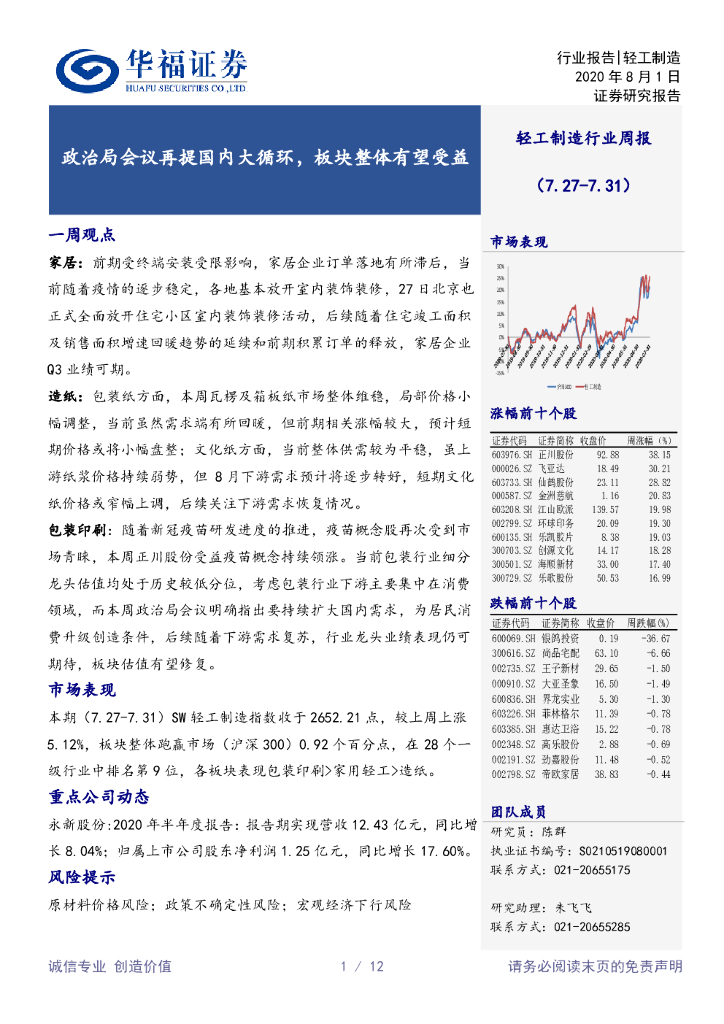 华福证券:轻工制造行业周报:政治局会议再提国内大循环,板块整体有望受益.pdf