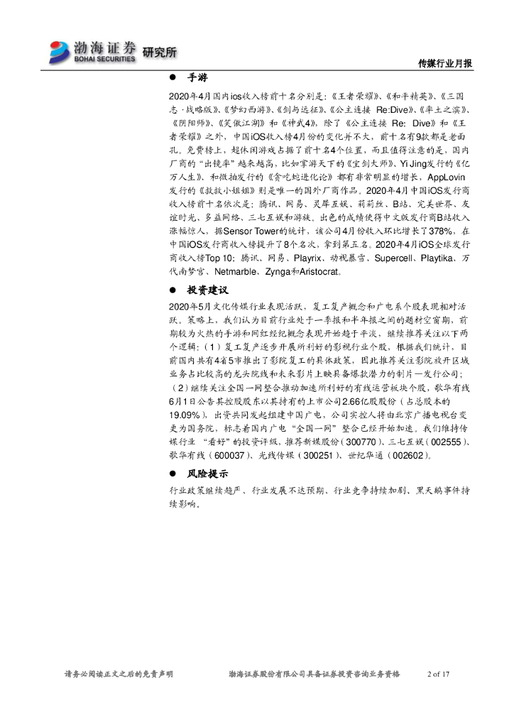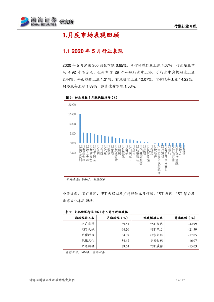 渤海证券:传媒行业月报:5月行业表现活跃,关注低位复工龙头.pdf