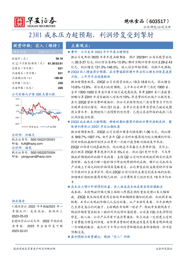 华安证券:绝味食品(603517)-23H1成本压力超预期,利润修复受到掣肘.pdf