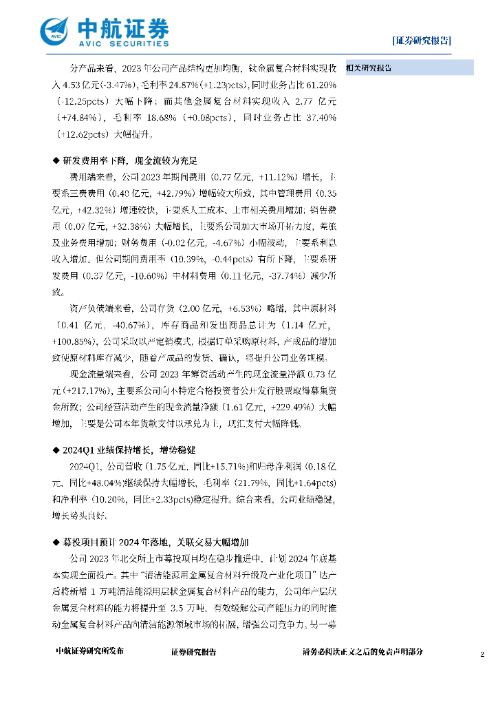 中航证券:天力复合(873576)-2023年报及2024年一季报点评:收入利润双增长,募投产能预计24年落地.pdf