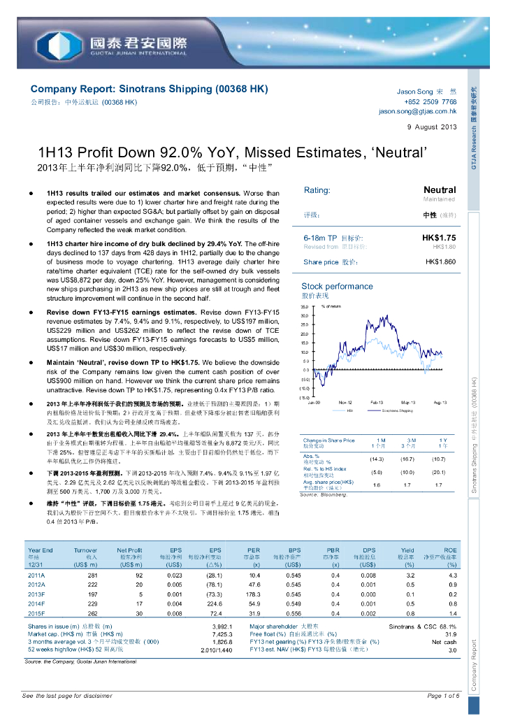 国泰君安证券(香港):德合集团(00368)港股公司研究报告-2013年上半年净利润同比下降92.0%,低于预期,“中性”.pdf