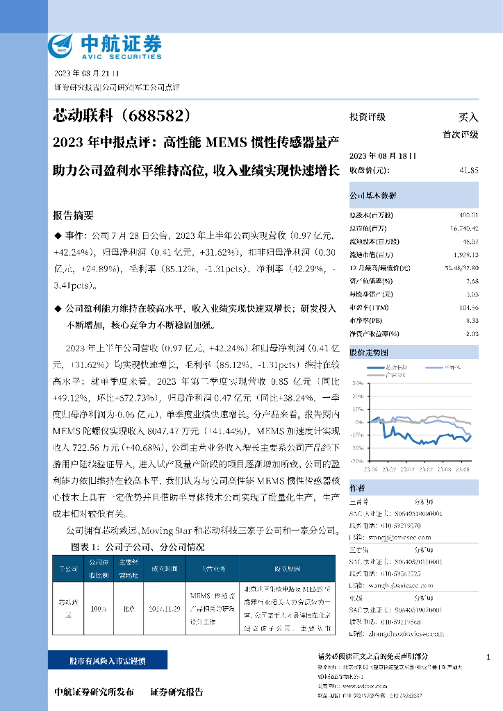 中航证券:芯动联科(688582)-2023年中报点评:高性能MEMS惯性传感器量产助力公司盈利水平维持高位,收入业绩实现快速增长.pdf