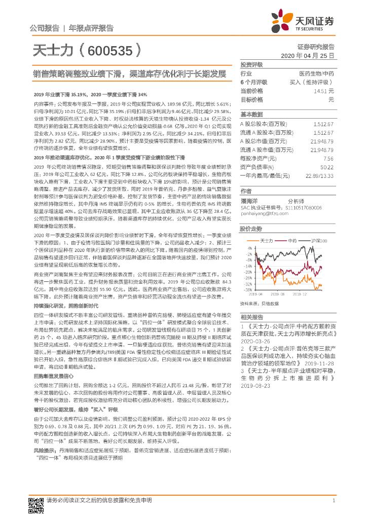 天风证券:天士力(600535)-销售策略调整致业绩下滑,渠道库存优化利于长期发展.pdf