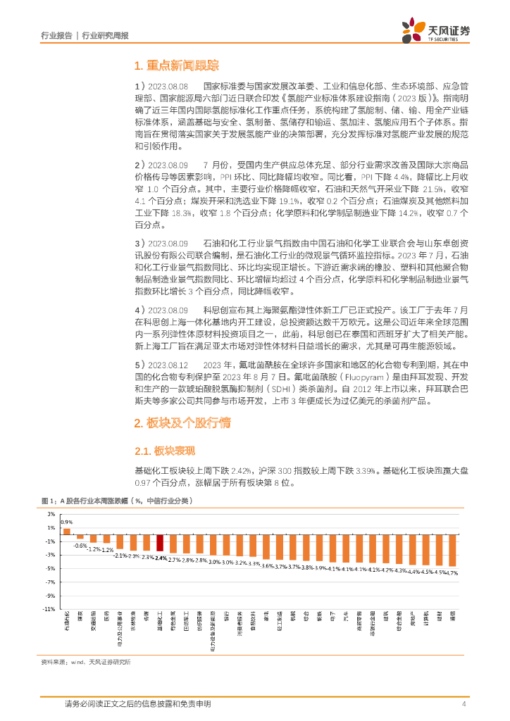 天风证券:基础化工行业研究周报:六部门联合印发《氢能产业标准体系建设指南(2023版)》,纯MDI、醋酸价格上涨.pdf