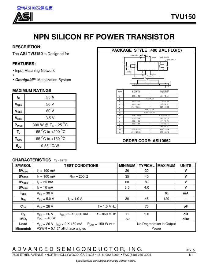 NPN SILICON RF POWER TRANSISTOR TVU150 数据手册.pdf