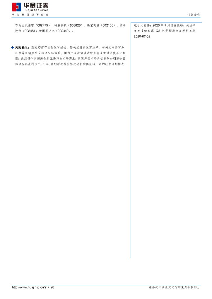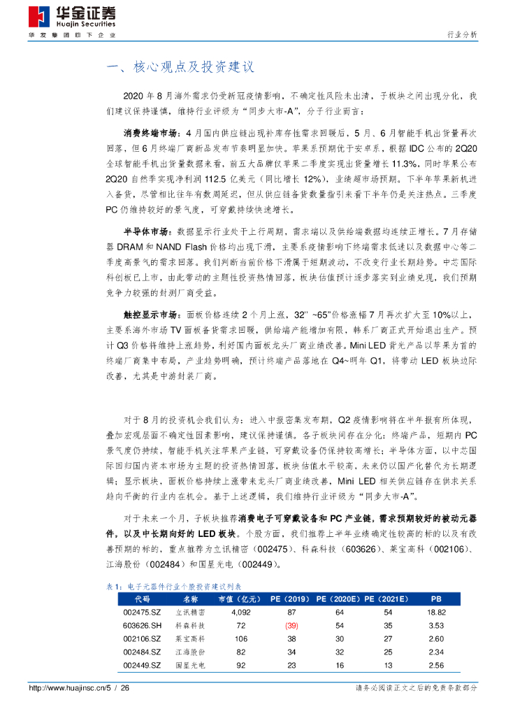华金证券:电子元器件行业分析:2020年8月投资策略:关注2020中报业绩披露 寻求估值与基本面平衡.pdf