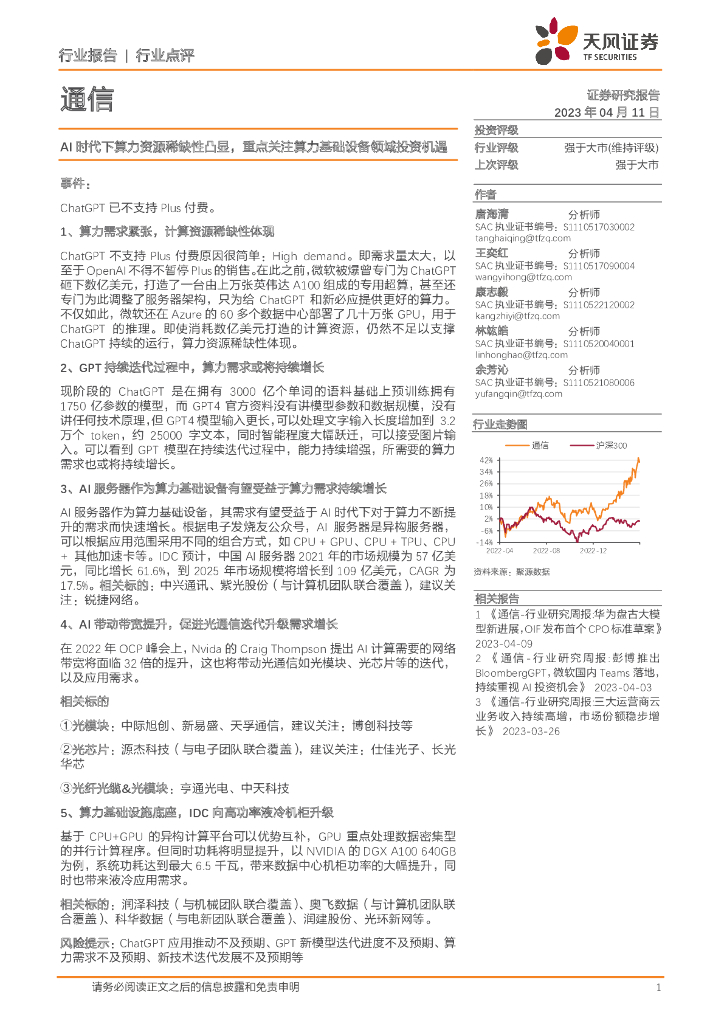 天风证券:通信行业报告:AI时代下算力资源稀缺性凸显,重点关注算力基础设备领域投资机遇.pdf
