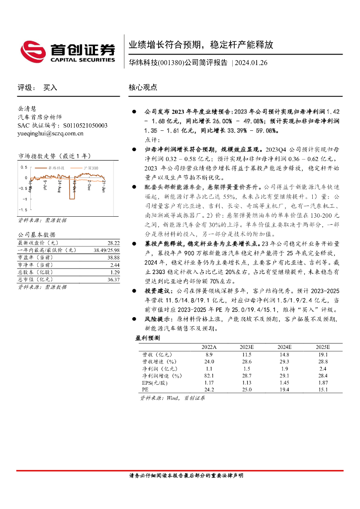 首创证券:华纬科技(001380)-公司简评报告:业绩增长符合预期,稳定杆产能释放.pdf