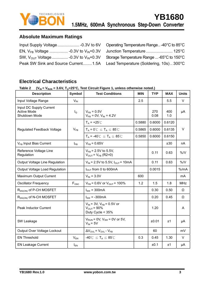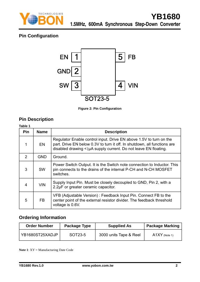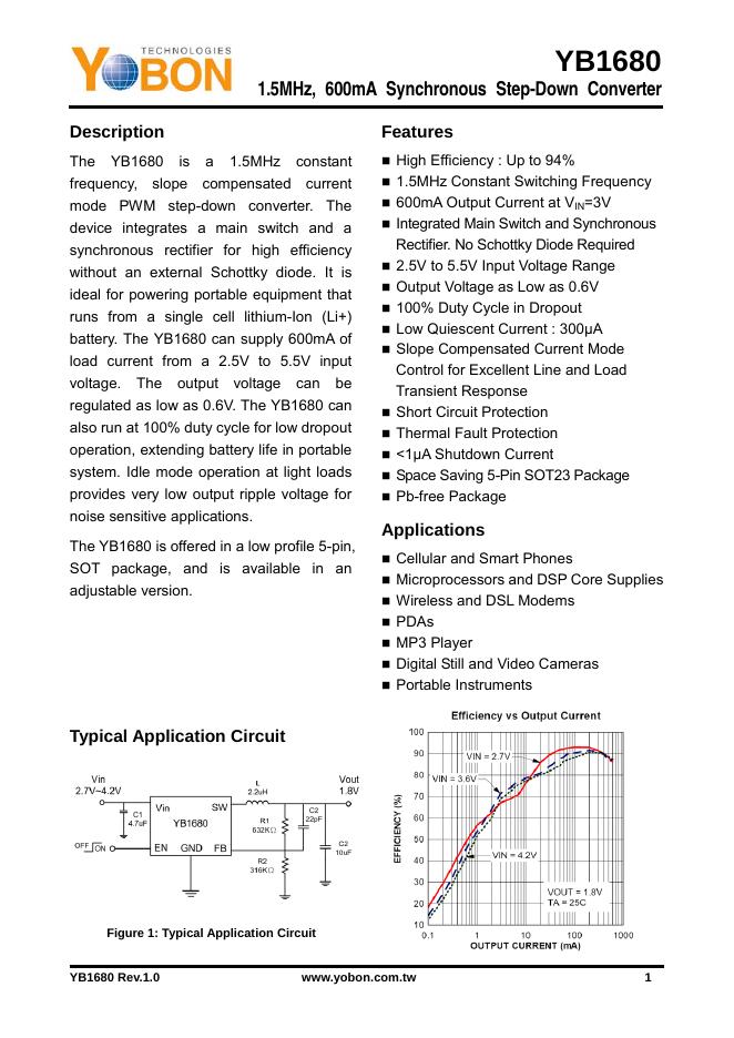 yobon YB1680 1.5MHz, 600mA Synchronous Step-Down Converter 数据手册.pdf