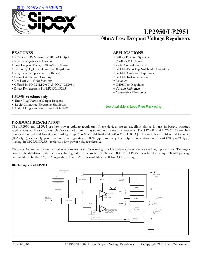 National semiconductor LP2950/LP2951 Series of Adjustable Micropower Voltage Regulators 说明书