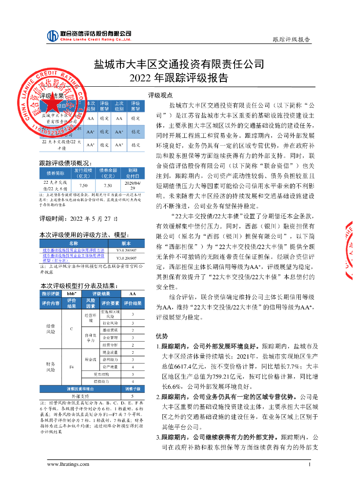联合资信:盐城市大丰区交通投资有限责任公司2022年跟踪评级报告.pdf