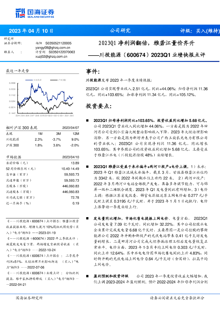 国海证券:川投能源(600674)-2023Q1业绩快报点评:2023Q1净利润翻倍,雅砻江量价齐升.pdf