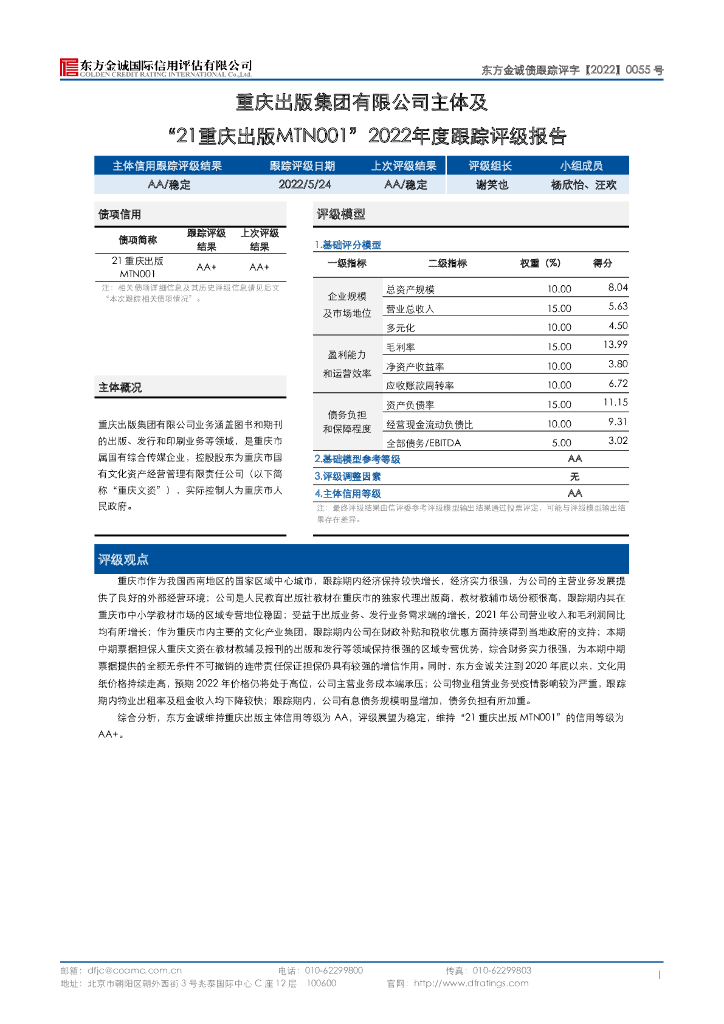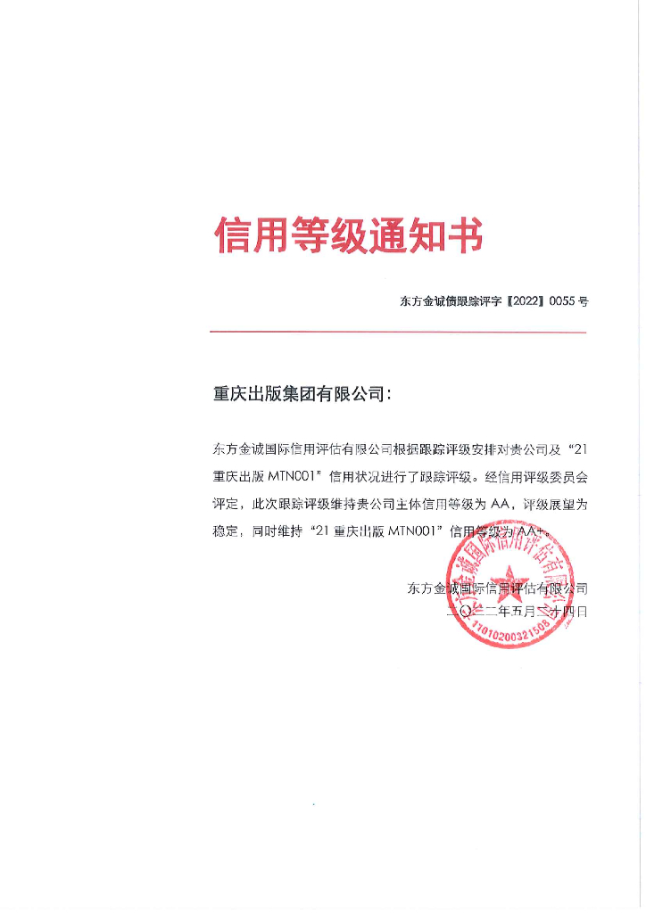 东方金诚:重庆出版集团有限公司主体及“21重庆出版MTN001”2022年度跟踪评级报告.pdf