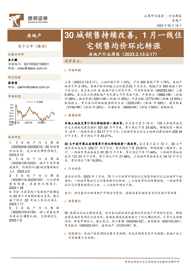 德邦证券:房地产行业周报:30城销售持续改善,1月一线住宅销售均价环比转涨.pdf
