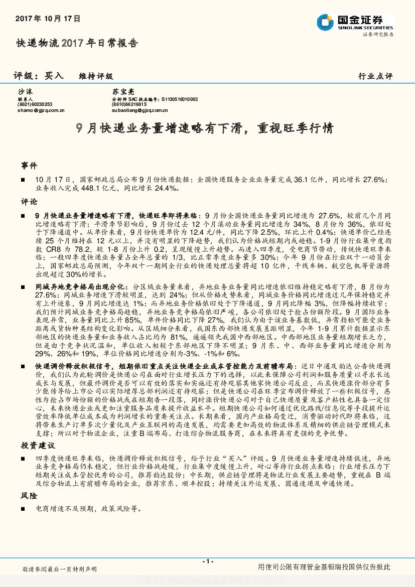 国金证券:快递物流2017年日常报告:9月快递业务量增速略有下滑,重视旺季行情.pdf