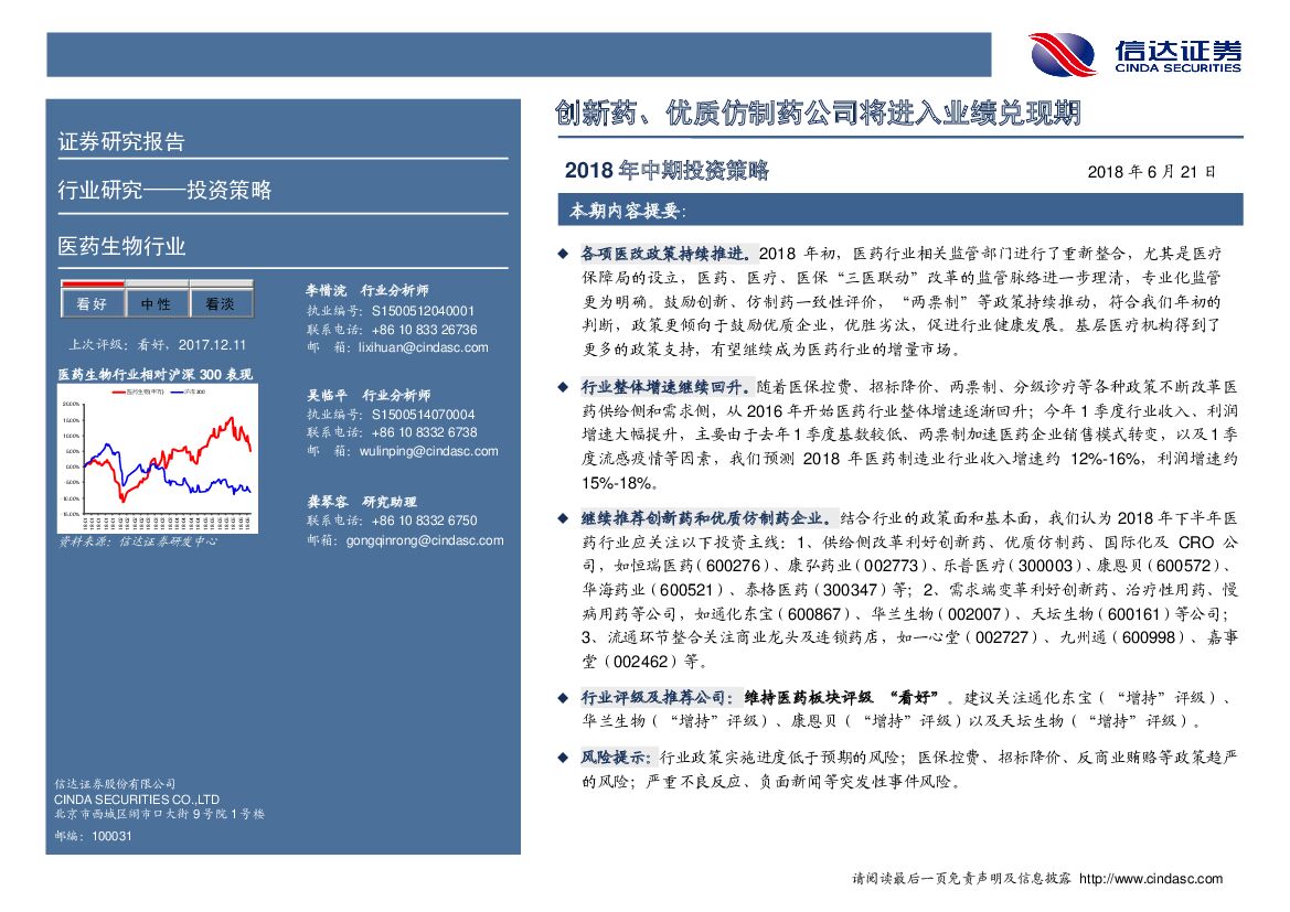 信达证券:医药生物行业2018年中期投资策略:创新药、优质仿制药公司将进入业绩兑现期.pdf