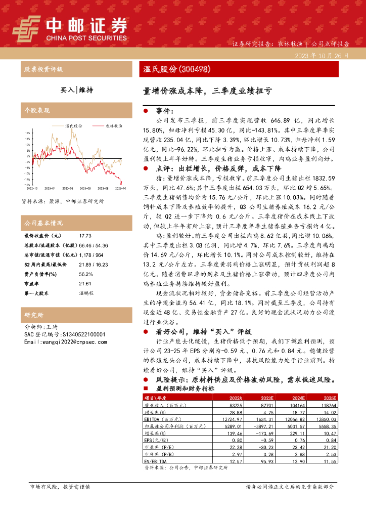 中邮证券:温氏股份(300498)-量增价涨成本降,三季度业绩扭亏.pdf