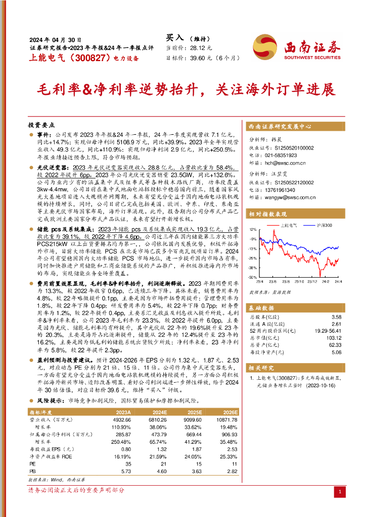 西南证券:上能电气(300827)-毛利率&净利率逆势抬升,关注海外订单进展.pdf
