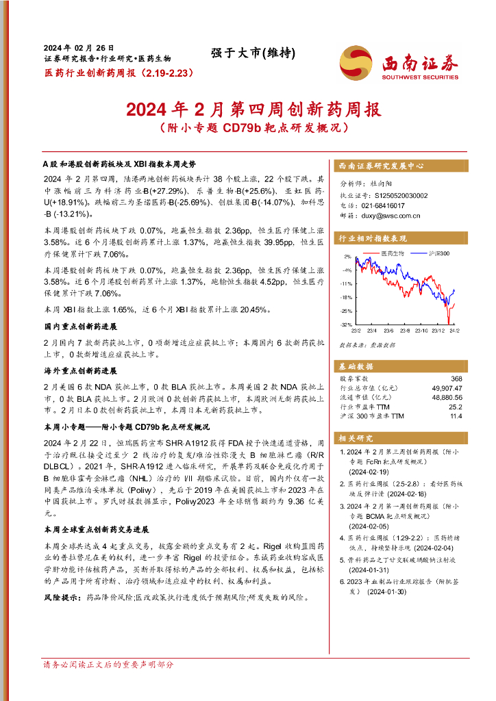 西南证券:医药行业创新药周报:2024年2月第四周创新药周报(附小专题CD79b靶点研发概况).pdf