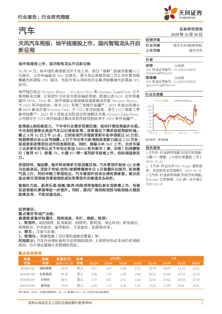 天风证券:汽车行业周报:地平线港股上市,国内智驾龙头开启新征程.pdf