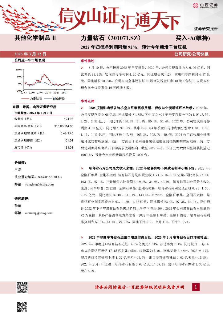 山西证券:力量钻石(301071)-2022年归母净利润同增92%,预计今年新增千台压机.pdf