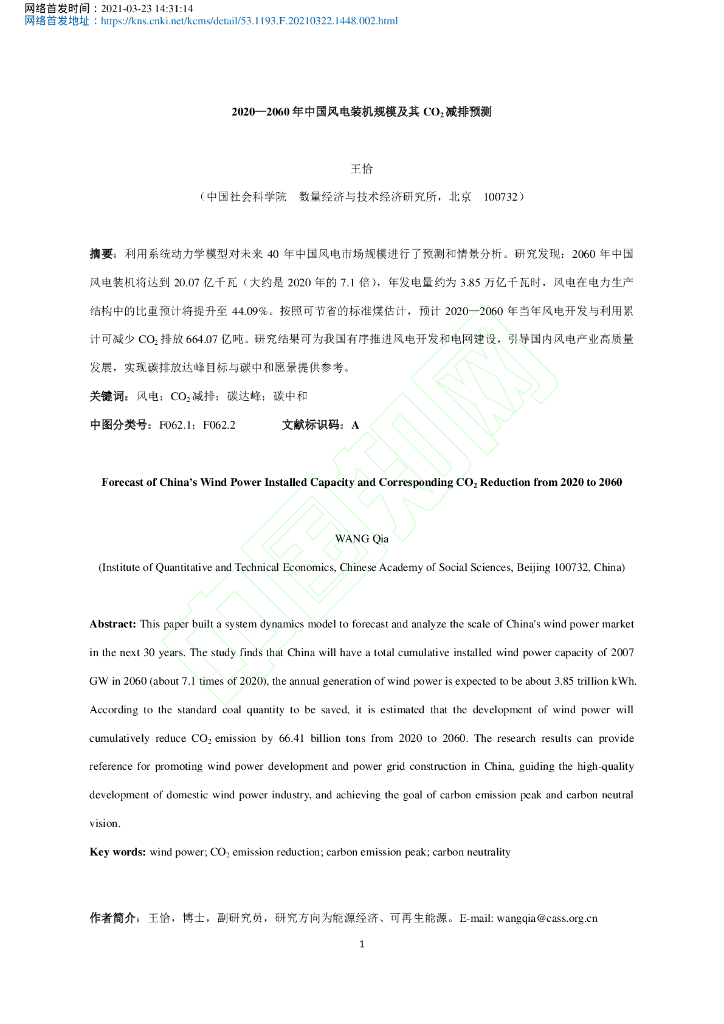 王恰:2020—2060 年中国风电装机规模及其CO2减排预测.pdf