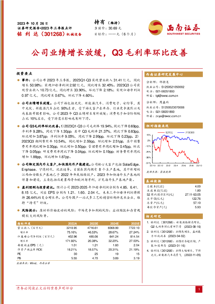 西南证券:铭利达(301268)-2023年三季报点评:公司业绩增长放缓,Q3毛利率环比改善.pdf