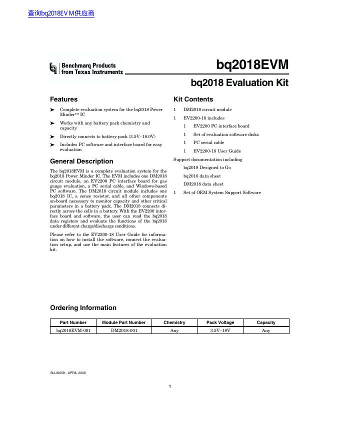 TEXAS INSTRUMENTS bq2018EVM 数据手册.pdf