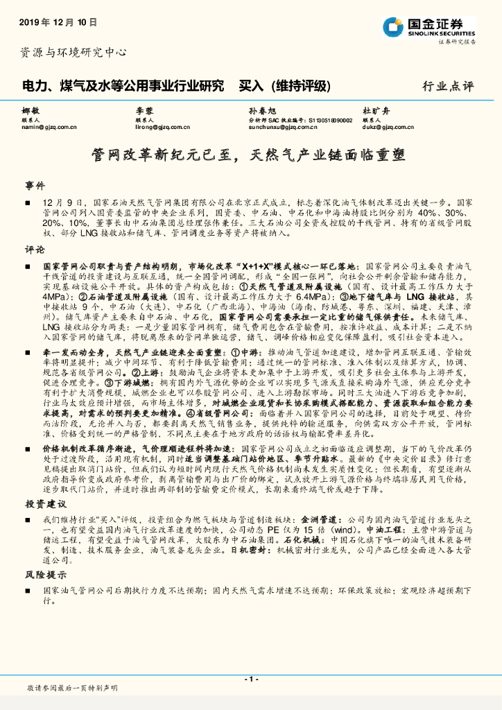 国金证券:电力、煤气及水等公用事业行业研究:管网改革新纪元已至,天然气产业链面临重塑.pdf