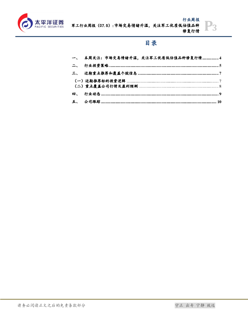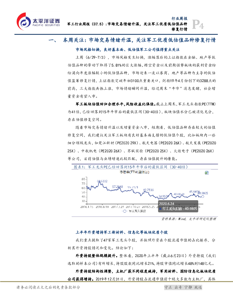 太平洋证券:军工行业周报:市场交易情绪升温,关注军工优质低估值品种修复行情.pdf